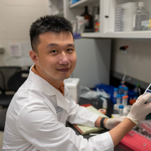 Emerging evidence underscores the profound impact of the gut microbiome, a collection of microorganisms within our digestive system, on cancer. These microorganisms collectively generate various metabolites that can significantly influence cancer progression and treatment outcomes. Dr. Zeng [Fraternal Order of Eagles Fellow] is employing synthetic communities and mouse cancer models to delve into the intricate connections between cancer and the microbiome. His synthetic communities, comprised of over 100 strains, allow for precise manipulation of the microbiome to elucidate the role of specific microbial metabolites in cancer. Additionally, Dr. Zeng is studying community-scale metabolism and using genetically edited strains to design synthetic communities with desired metabolic profiles. These approaches will gain valuable insights into microbiome-cancer interactions and establish a broadly applicable strategy to harness the therapeutic potential of gut microbiome. Dr. Zeng received his PhD from Princeton University, Princeton and his BS from Tsinghua University, Beijing.