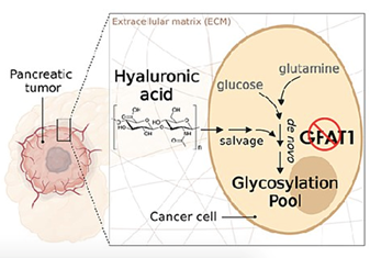 . Pancreatic cancers face the additional challenge of growing in a low-nutrient environment due to the pancreatic tumor’s relative lack of blood circulation. In order to survive in these conditions, pancreatic cancer cells adjust their metabolism to derive fuel from the nutrients available—namely, HA, abundant in the tumor environment.